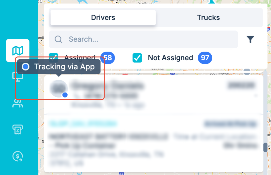 In PortPro, you can identify whether a driver’s location is being tracked via ELD, mobile app, or not at all using the status dot next to their name.