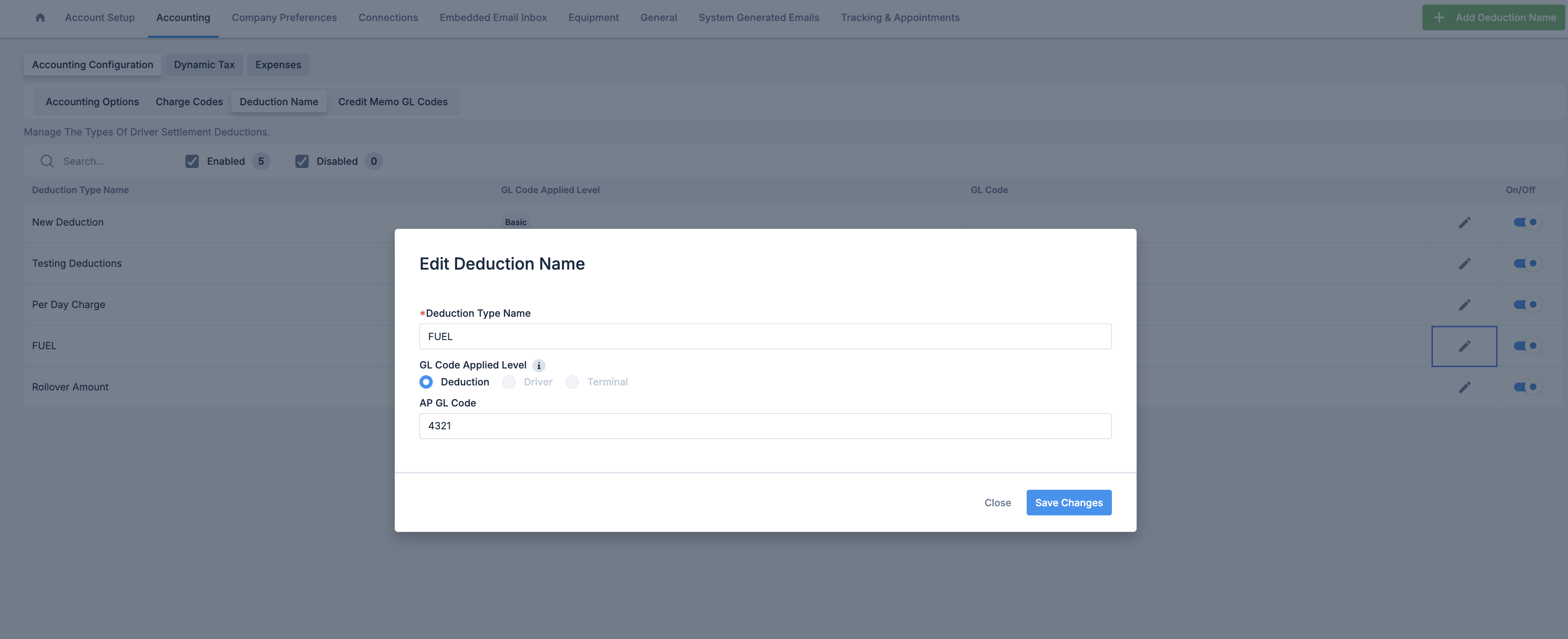 Driver Level - a driver specific GL code will apply when the deduction is added to that specific driver.