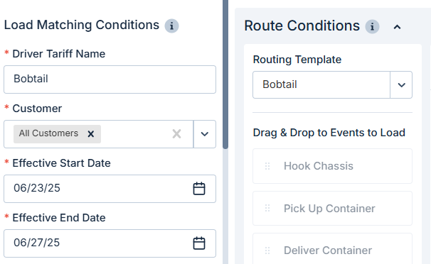 3. Add the tariff load matching conditions, which can be set for All Customers or individualized per customer. The Routing Template will be Bobtail to match the support move when it is added.