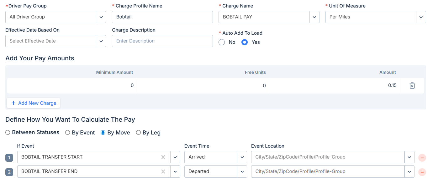 5. Set up the charge profile for the bobtail. This can be fixed, radius, etc. The example here is to pay the driver $0.15 per mile for the bobtail distance: